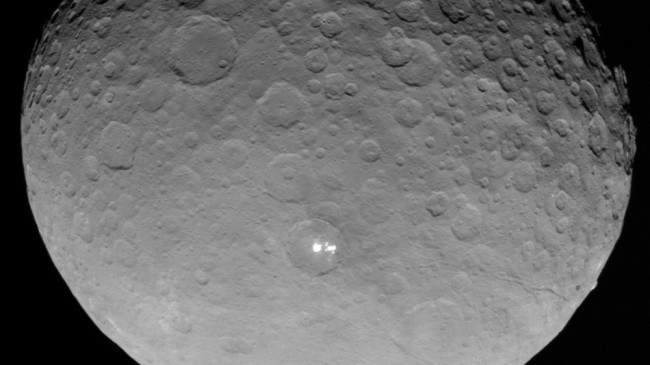 Christopher Russell, le principal responsable de la mission Dawn a déclaré que les scientifiques estiment que les points lumineux sont provoqués par la réflection du soleil sur des matériaux hautement réfléchissants sur la surface. Les chercheurs suggèrent que cela pourrait être de la glace. La sonde Dawn a pris ces images le 3 et le 4 mai alors qu’elle était à 13 600 kilomètres de la surface de Ceres. Les zones réfléchissantes révélés par les nouvelles photos montrent qu’il s’agit de groupes de petits points.