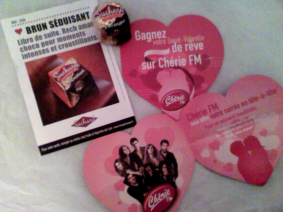 Un rocher Suchard distribué avec un prospectus d’accompagnement et un flyer coeur Chérie FM. Là, sur le moment, je ne me pose pas de question, j’ai eu mon cadooooooo : un rocher Suchard avec un nouveau goût, Meringue Je le donne à Benj parce que moi j’arrive plus trop à manger du trop sucré (et non je suis pas au régime, pffff les clichés…) … bizarre d’ailleurs.