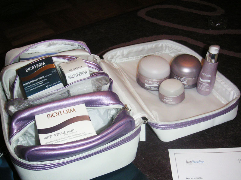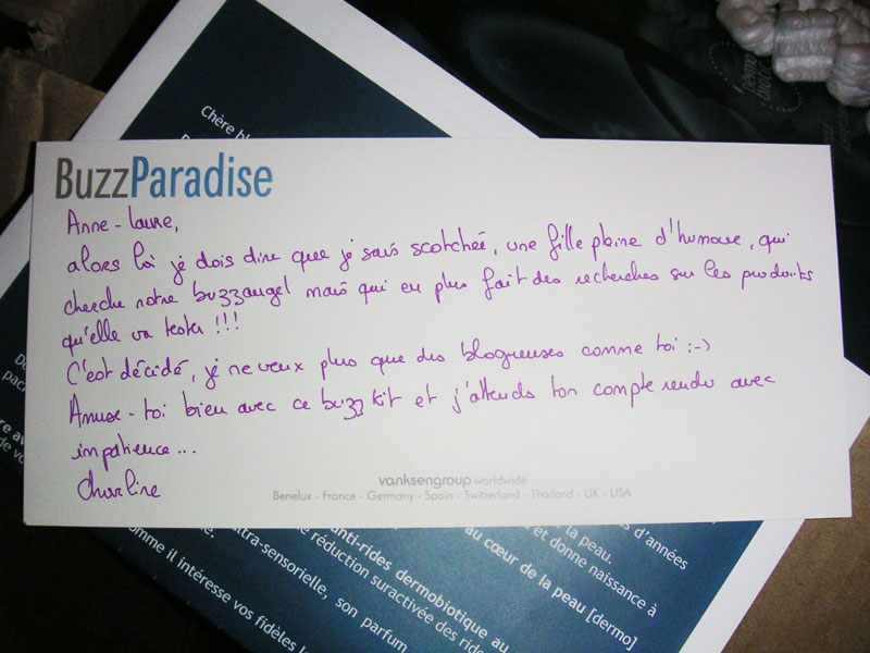 Avec le petit mot, deux courriers de Biotherm et Buzz Paradise. J’avoue, je ne les ai pas lu tout de suite… bein vi… chui une fille… donc j’ai foncé sur le reste, les produits!!!