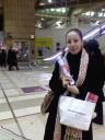 Suite à ça les passants commencent à nous aborder. Moi, alors que j’allais chercher dans la foule quelqu’un à qui donner mon texte, je suis interpellée par une gentille demoiselle. A peine quelques paroles échangées et je lui remet mon texte. Elle est toute contente et ça me fait plaisir ! Je lui explique un peu tout, on discute, bref une heureuse rencontre. D’ailleurs elle est tellement sympa qu’elle veut bien poser pour l’occasion. Et puis elle a tenu promesse, elle est venue sur le blog laisser un commentaire, déjà, sur le billet des 3 espaces. J’espère qu’elle reviendra pour voir celui-là (et puis même d’autres, ou juste pour sympatiser, qui sait !).