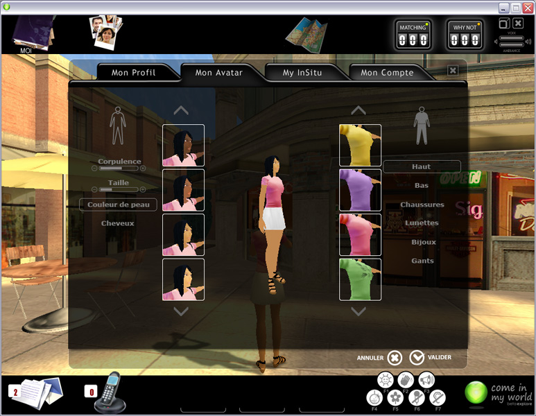 Ayant signalé cette frustration, l’équipe de CimW m’a signalé qu’ils allaient réfléchir à nos remarques. Je rajouterai aussi que niveau physique c’est raide aussi comme choix. Je sais que de nos jours on peut largement travailler un visage 3D plus précisément : là même pas de possibilité de se faire des yeux bridés… (oui je ne suis pas asiatique et alors, je pense aux autres c’est tout). Bon en même temps la photo solutionne ce problème et CimW n’est pas un jeu vidéo mais je serais quand même pour pousser la personnalisation un peu plus loin histoire 2 rentrer à fond dans le concept « rencontres virtuelles mais comme en vrai ».