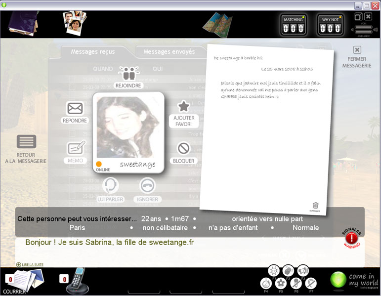 Je commence fort puisque je tombe sur Mr le Directeur en chef de CimW, dit le castor mais j’ose quand même le cuisiner d’autant qu’il est sympa. Il m’explique que Come in my World, créé donc par Orange du groupe France Télécom et donc français, porte un nom en anglais pour s’inscrire dans une perspective internationale. Ensuite j’enchaîne avec aymeric, juki75, grandrien, natty, jicem, reno, jé, nicoola, zolive,… C’est marrant, il sont tous ingénieurs ou dans la com’, comme deparnazar, on les repère vite les mecs accrochés à leur ordi 😉 Je la joue fine à chaque fois, je discute mine de rien (culpabilisant un peu intérieurement pour la « manipulation »), mais à chaque fois c’est pas eux. Zut de zut, pourtant c’est pas comme si je ne m’acharnais pas.