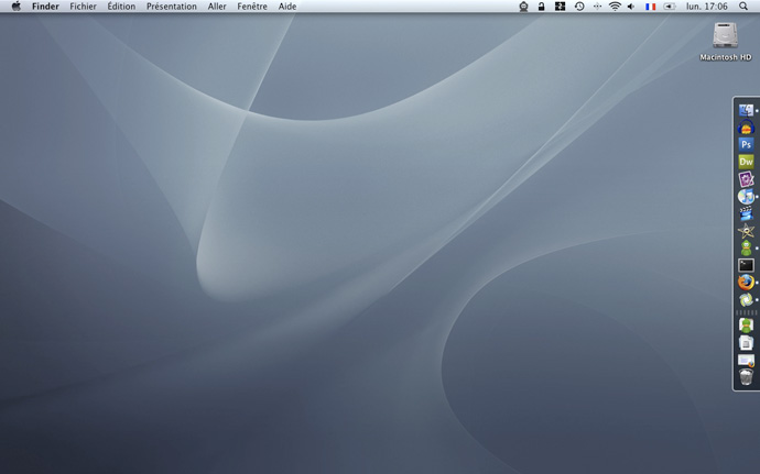 Comme vous pouvez le voir j’ai pour l’instant placé le dock à droite et j’ai mis le moins de raccourcis possible dedans.
