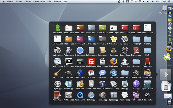 Pour obtenir un aperçu de vos applications comme ci-dessus, il vous suffit tout simplement de faire glisser dans le dock le dossier application à partir du Finder.