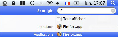 Ainsi pour lancer Firefox, par exemple, je clique sur la loupe, tape les premières lettre du nom de l’application (Fi), et presse la touche « Entrée » et Firefox se lance … C’est très rapide, et je pense que d’ici quelques jours je vais finir par désactiver le dock qui occupe trop de place sur mon écran …