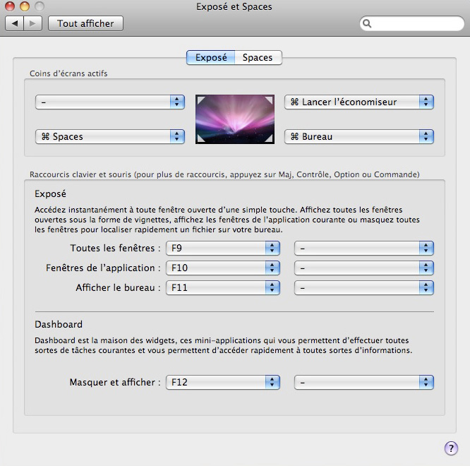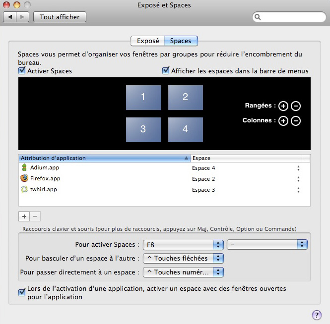 J’ai suivi ses conseils et je dois dire que après quelques jours d’utilisation des bureaux virtuels de Mac OS (Spaces) je ne peux plus m’en passer.