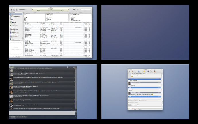 Sur le premier bureau je lance mes applications (photoshop, iTunes, …), sur le second Firefox, sur le troisième Twhirl (mon client twitter), et sur le quatrième l’excellent Adium (client de messagerie instantané que j’utilise pour MSN, Gtalk, et Facebook).