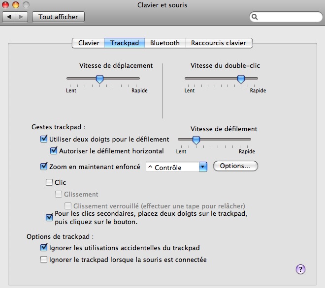 Et pour la souris (ou plutôt le Trackpad), suite à une discussion avec Gonzague, j’ai activé les 2 options qui permettent de faire défiler une page en faisant simplement glisser deux doigts sur le Trackpad et la possibilité de faire un clic droit simplement en mettant deux doigts sur Trackpad et en cliquant :