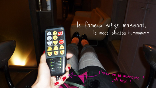 Sortant de chez le coiffeur depuis moins d’une semaine je n’ai pas testé le bac ni le coup de ciseaux mais j’ai passé 15 bonnes minutes sur le siège massant (juste ouiiiiiiiii) du bac en question après m’être fait faire les ongles avec le rouge Griotte de Peggy Sage (note à moi-même : pensez à l’acheter) et m’être fait maquiller.