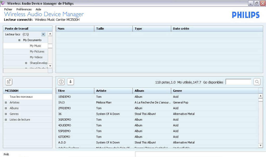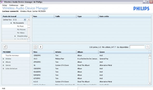 Vous pouvez installer sous Windows le logiciel « Wireless Audio Device Manager » fourni avec la chaine qui vous permettra de copier directement sur votre chaine Philips la musique de votre PC et de gérer vos playlists.