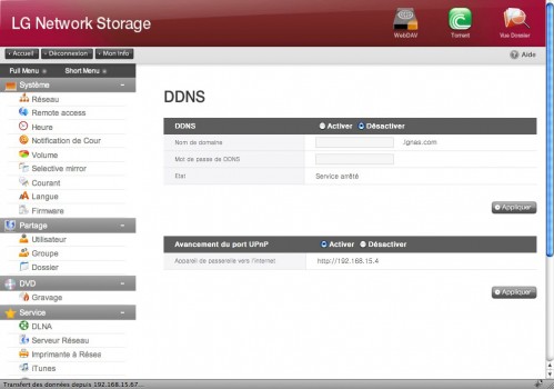 L’interface d’administration est accessible depuis n’importe où à l’aide d’un simple navigateur web et il est même possible de choisir l’url depuis laquelle vous pourrez accéder à l’interface d’administration (ex: http://h2.lgnas.com).