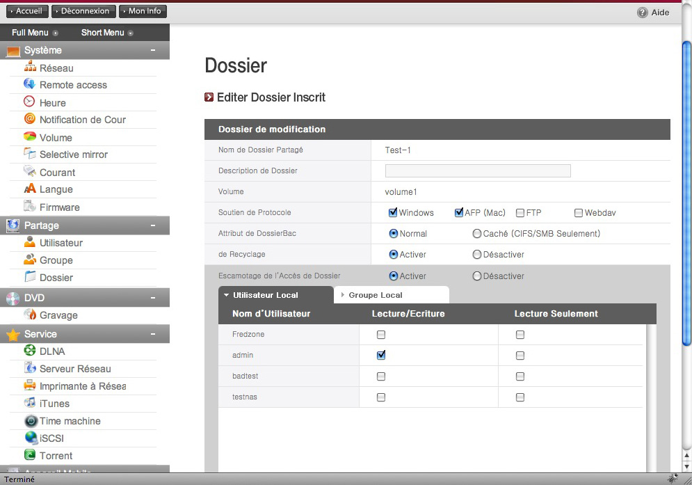 Il est possible de créer des comptes utilisateurs, de gérer des groupes d’utilisateurs, et de créer des partages en attribuant des droits différents aux groupes et/ou aux utilisateurs.