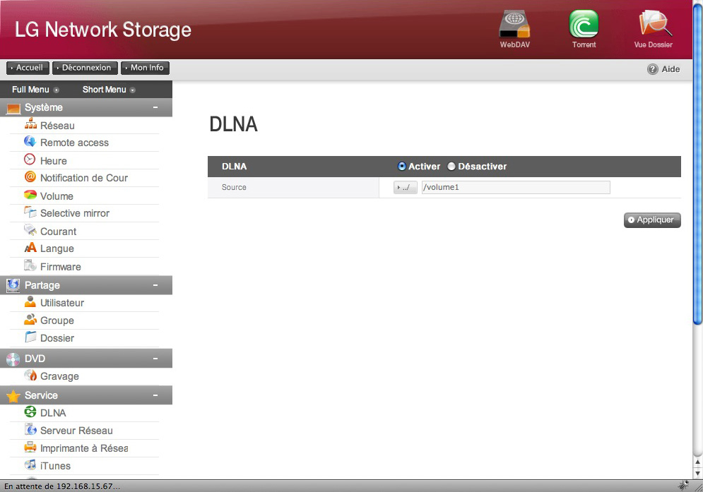 Le Nas est compatible DLNA mais malheureusement il n’est possible de sélectionner qu’un dossier dont les contenus seront streamés…