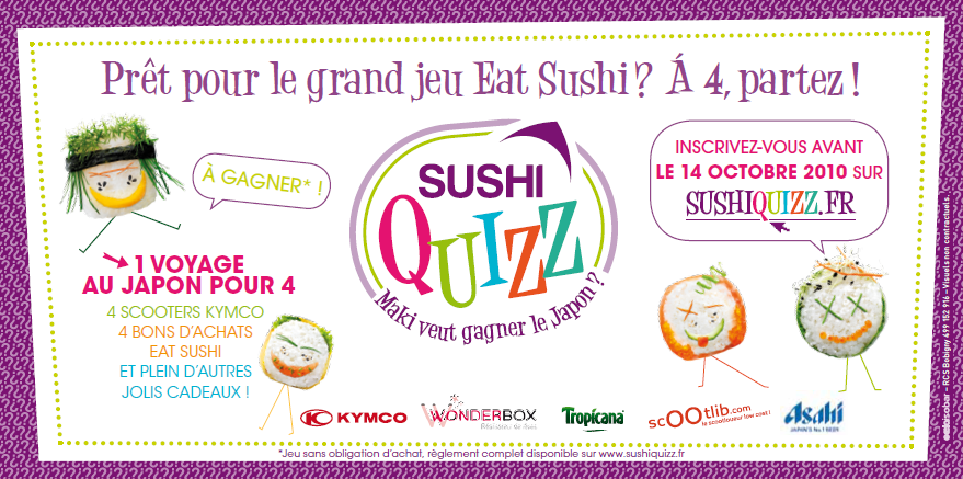 Il suffit d’aller sur le site www.sushiquizz.fr, de s’inscrire avant le 13 Octobre 2010 minuit, avoir à disposition un ordinateur pour la suite (vous allez voir), avoir quelques neurones (on fait au mieux ;p) et une énorme envie de partir au Japon (ah bah ça c’est bon o/).