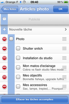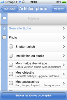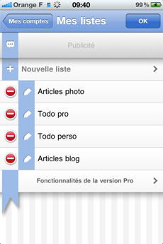 L’application est gratuite (Lien iTunes) mais il existe une version Pro (upgrade vers la version Pro directement au sein de l’application avec le « in app purchases ») permettant de gérer plus de listes de tâches (je crois que la version gratuite est limité à 4 listes) et de ne pas avoir de pub…