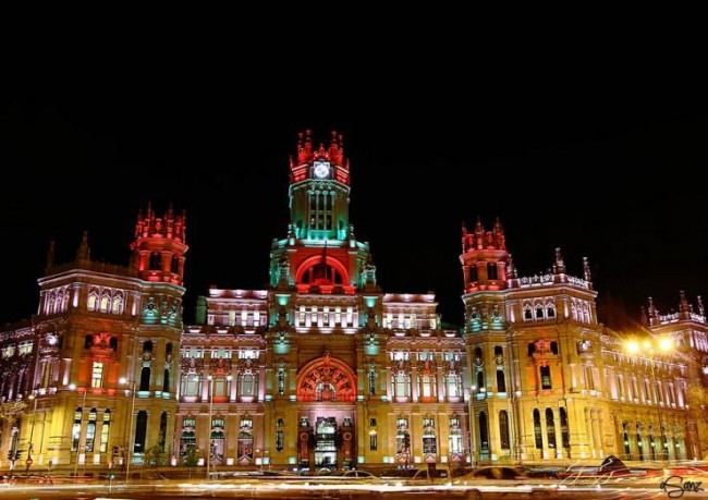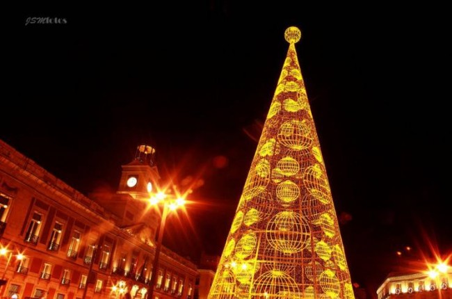Madrid possède une tradition de sapin de Noel écologiques. Cette année, le sapin de Noel doré orne la ville royale et il est entouré par une architecture historique. Les couleurs dorées du sapin correspondent parfaitement avec l’environnement.