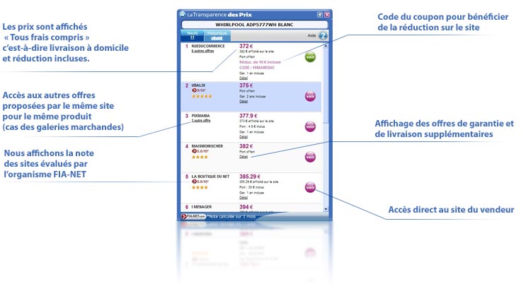 Le widget interagit directement avec les sites de vente en ligne – sites français pour le moment mais l’international est prévu – et il est à noter que La transparence des Prix ne monétise pas le référencement, pour fonctionner en toute indépendance, mais dépend uniquement de l’affiliation.
