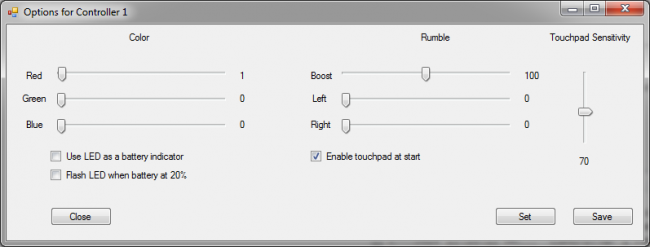 Si vous voulez personnaliser l’application, cliquez sur le bouton Options et une fenêtre va s’afficher avec des glisseurs. Ces derniers vous permettront de changer la couleur et l’intensité de la barre de lumières de la manette PS4 ou de transformer cette barre de lumières en un indicateur de batterie. Vous pourrez également configurer les vibrations ou faire en sorte que le Touchpad de la manette PS4 puisse contrôler le pointeur de la souris.